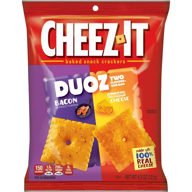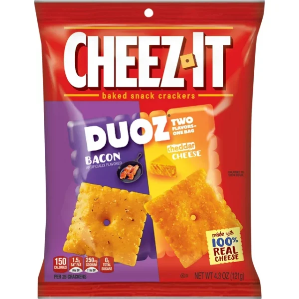 - Cheez-It DUOZ Bacon & Cheddar Crackers are an ideal companion for meals, afternoon and late-night snacking, or busy, on-the-go moments. Your taste buds will love the delicious combination of cheddar and smoky bacon flavor in every handful